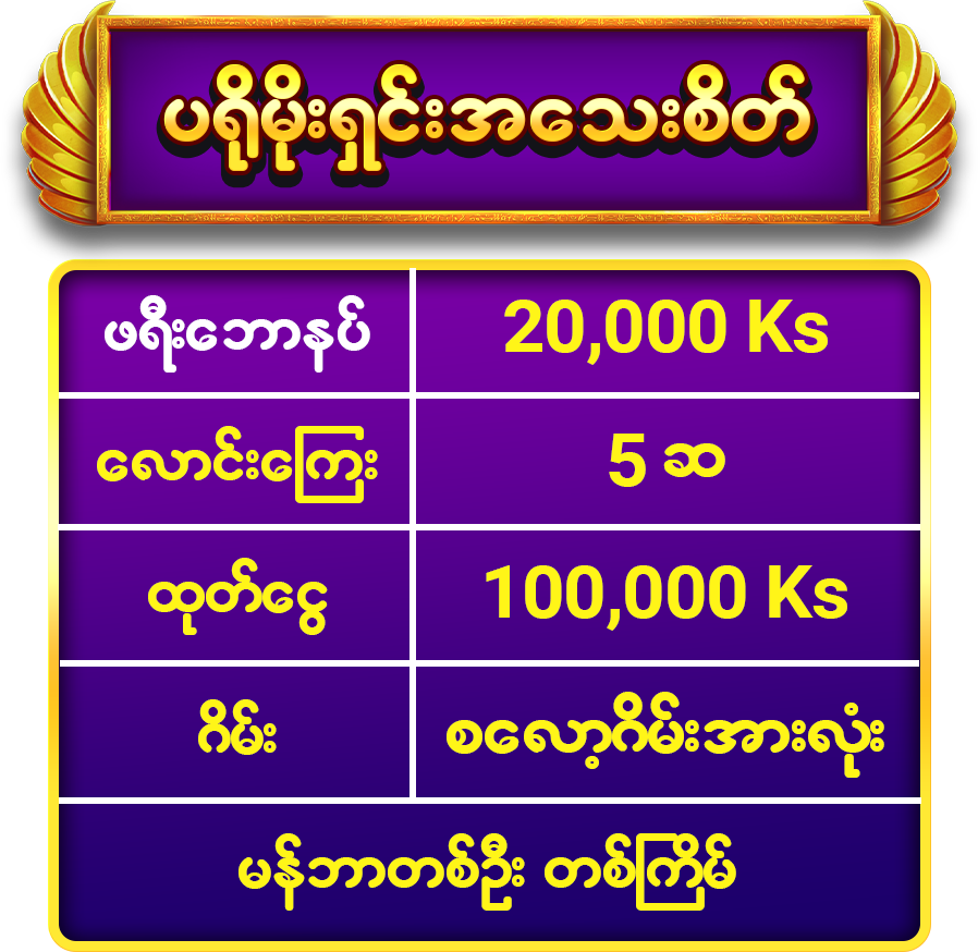 ✅ ပ႐ိုမိုးရွင္းအား 01/09/2025 ေနာက္ပိုင္း 3,000 က်ပ္ေငြသြင္းကစားထားေသာ မန္ဘာဝင္တိုင္း ပါဝင္ႏိုင္သည္။မန္ဘာတစ္ဦးကိုတစ္ႀကိမ္ရယူႏိုင္သည္။