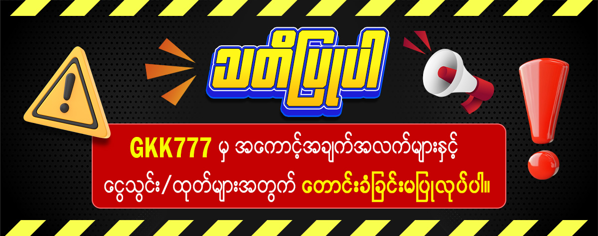 ⛔️ GKK777 မွသတ္မွတ္ထားေသာဆက္သြယ္ရန္ေနရာမ်ားမွဆက္သြယ္ေပးၾကပါရန္ႏွင့္ အျခားေနရာမွဆက္သြယ္ၿပီးျဖစ္ေပၚလာေသာျပသနာမ်ားကို (လုံးဝ)တာဝန္ယူေျဖရွင္းေပးမည္မဟုတ္ေၾကာင္းသတိေပးႏိုးေဆာ္ပါသည္။